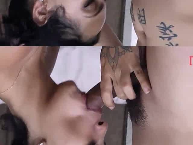 Small oriental pleasuring her american bf with her unshaved snatch