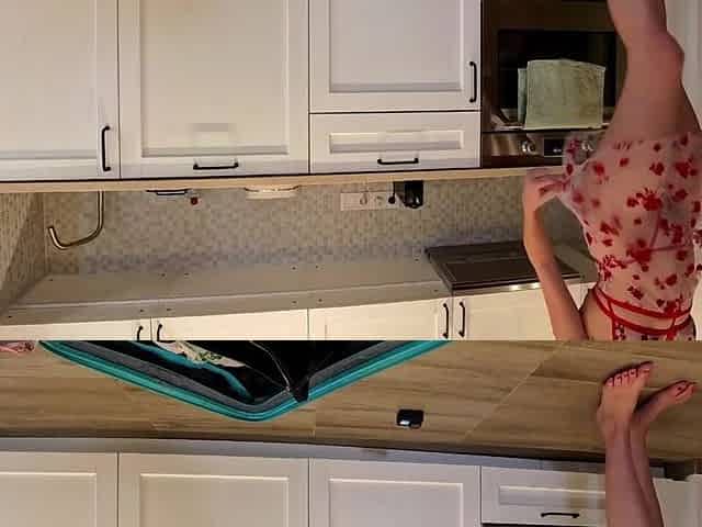 A skinny eighteen yo playgirl masturbates her very shaggy twat in the kitchen