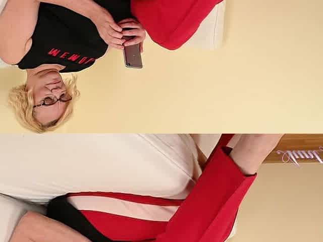 Blonde GILF Aliona Rubs Her Fullbush Pussy on the Loveseat