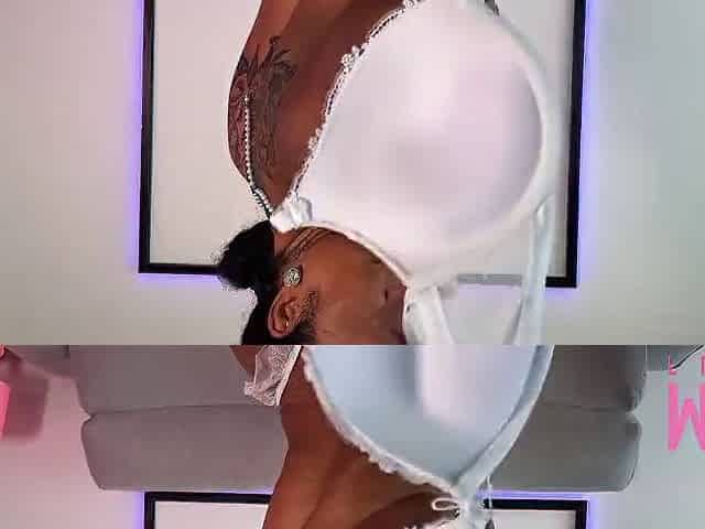 Bushy-haired ladyboy in ebony brassiere jerks off her large jock