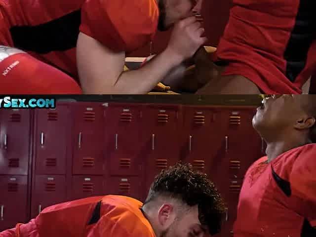 Athletic black stud bareback fucks boyfriend in sports locker room