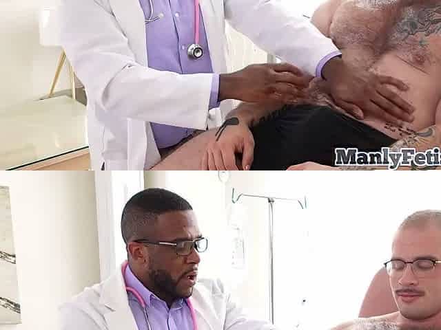 Muscular and oiled hunk masturbated by a black doctor in the infirmary