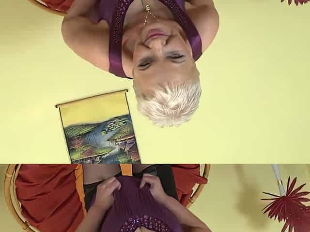 Granny with saggy bazookas and curly snatch masturbates