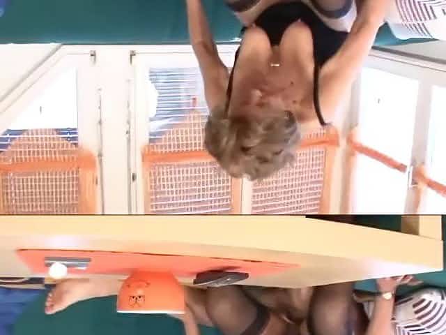 Hairy granny swallows two cocks at once in the office