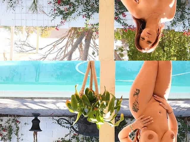 Mature tattooed babe shows off her natural tits and hairy pussy by the pool