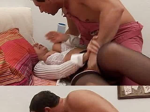 Mature woman with huge tits gets hairy pussy shaved and pounded deep on the bed by horny guy