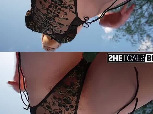 Solo Michelle enjoys while fingering her hairy pussy outdoors