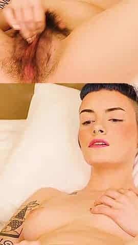 Redhead sweetheart Minnie Minx plays with her thick pubes up close