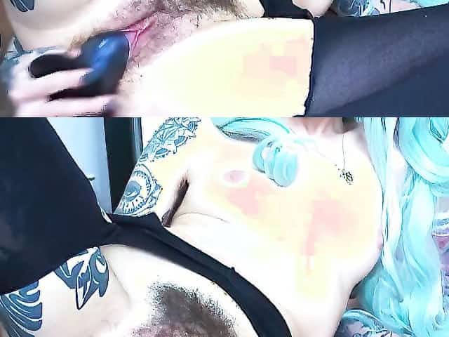 Hot Otaku sexy chick with green hair masturbates her hairy pussy