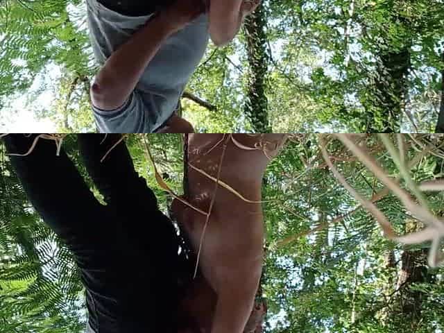 Cuffed muscle guy gets his turn while a redhead gets off in the mud