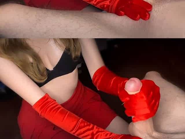Trampy student Missloveglove in a red mini skirt and satin gloves is eager for your manhood