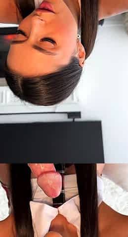 Adeline Murphy gives a handjob and blowjob while wearing satin gloves, finishing with cum