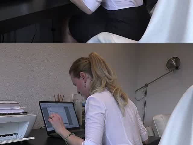 Sexy Brunette Bends Over Desk and Deepthroats Bottle
