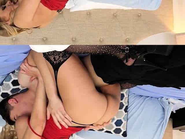 2 golden-haired individuals engage in raunchy intercourse in the same room