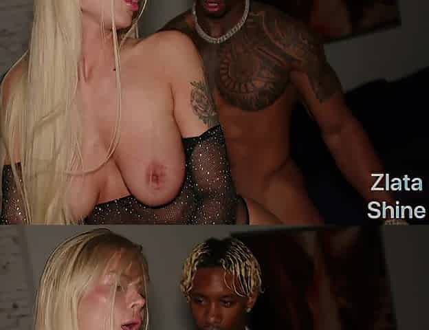 Brunette in fishnet lingerie gets her bald pussy stuffed by Zac Wild and Tommy King