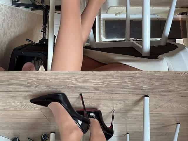 A bitch with beautiful legs does a footjop to a guy and gets cum on her feet