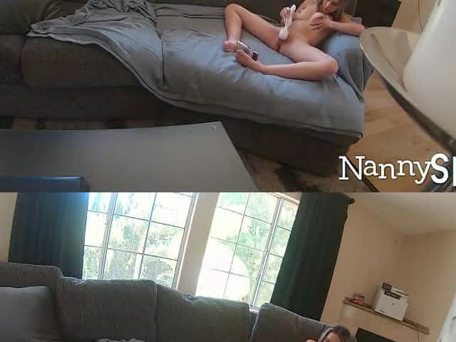 My stepmom caught on the couch with her dildo ()
