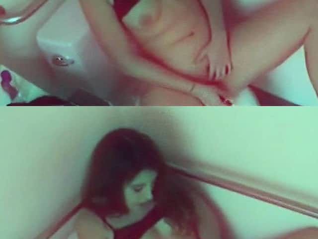 Brunette Girl rubbing and fingering her pussy at public toilet