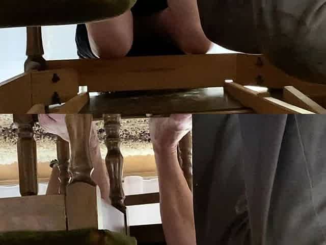 My mother in law spreads her legs under the desk