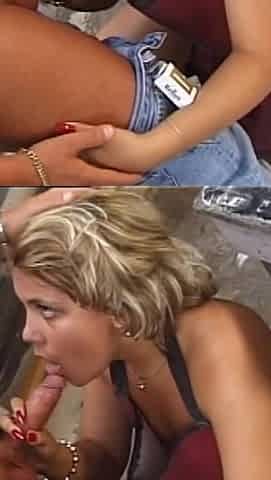 Golden-haired floozy in white nylons seduces the stud with the large schlong