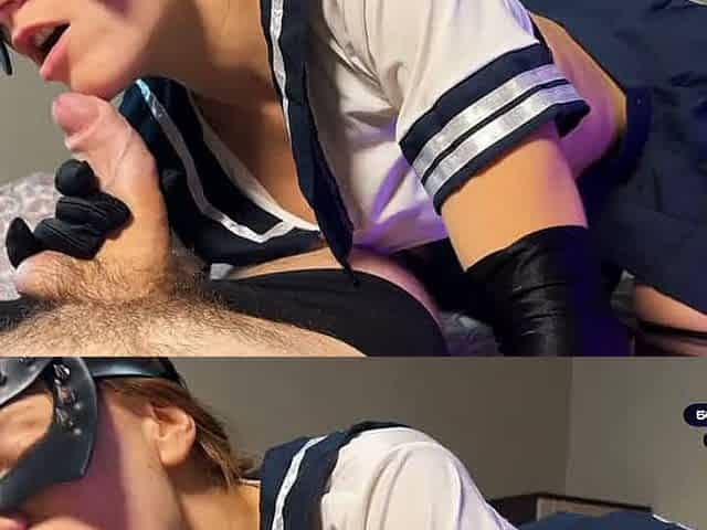Sucking a penis on my knees, wearing a mask with golden-haired hair, hose and high heels