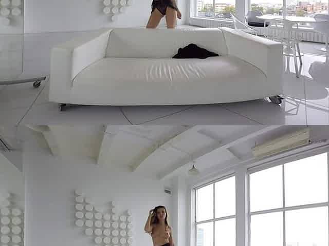 Regina Noir trying on high heels. Striptease in white underware and nylons 1
