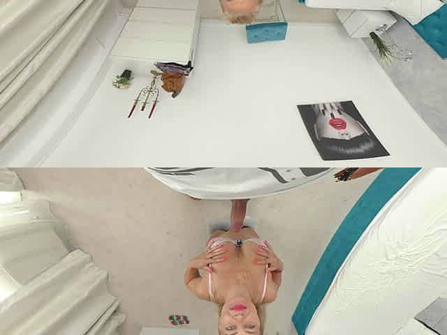 Sultry ash-blonde MILF in kinky lingerie rides my cowboy for a creampie.