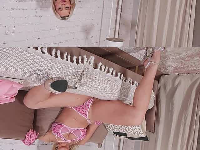 The busty blonde masturbates her bald pussy wearing sexy lingerie