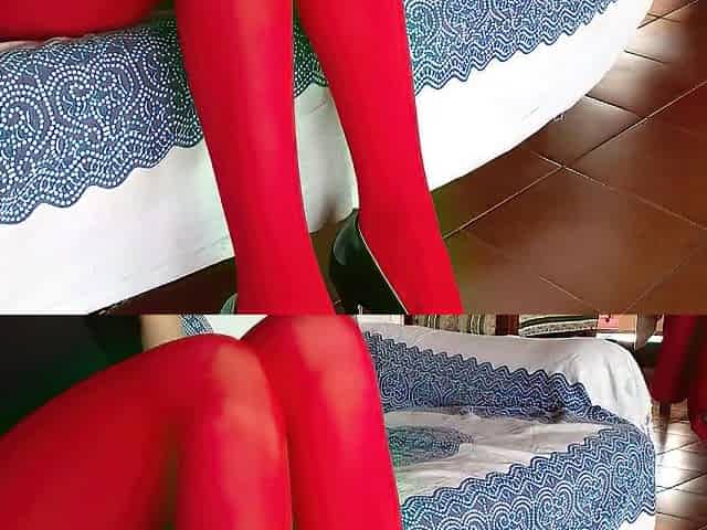 Laura on Heels amateur 2021 wearing red hose and ebony platform high heels