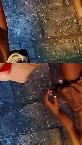 In her shiny silver swimsuit, she snagged a guy who made her squirt and cum hard