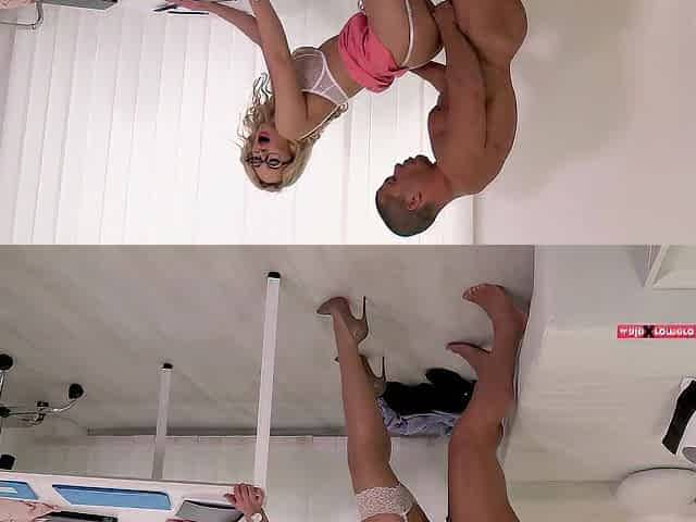 Sexy Brunette Bends Over Desk And Deepthroats Bottle With Cindy Hope