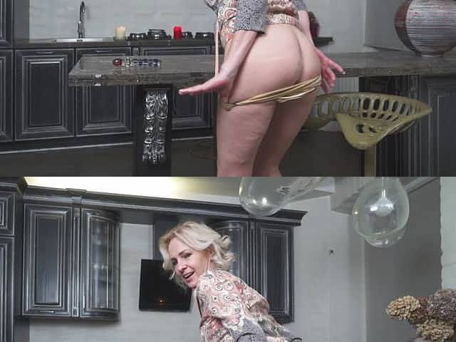 Home alone wife Artemia enjoys pleasuring her puss on the table