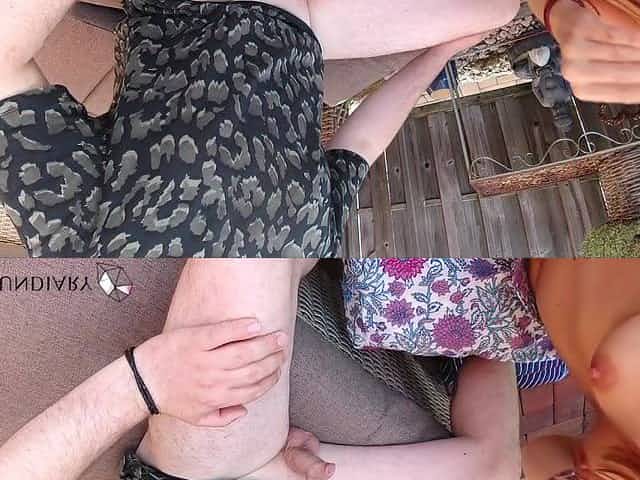 Voluptuous housewife fucks a guy in the backyard while her hubby is at home