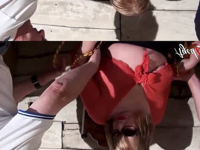 Aged blond prostitute was hired to amuse 2 lads at the same time and make 'em cum