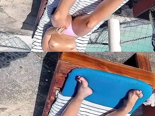 stepdaughter flashes her bazookas on a hotel lounger