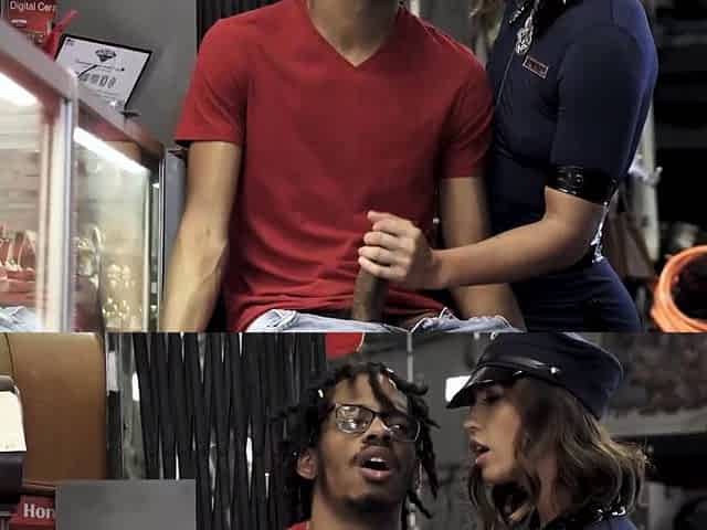 Busty ebony hottie August Skye takes ex's cock to save her current boyfriend from embarrassment