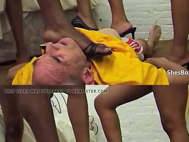 Old dude manhandled by three ebony women
