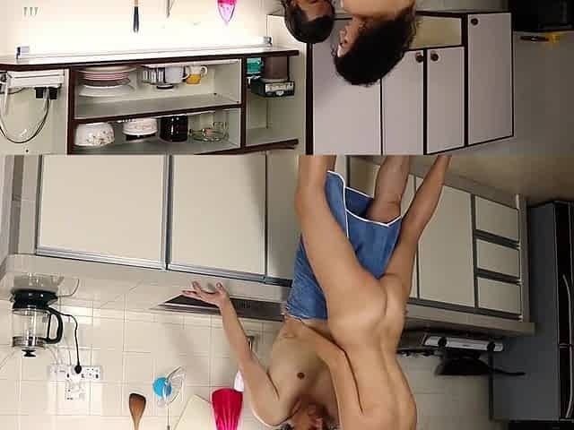 Married couple having fun naked in the kitchen