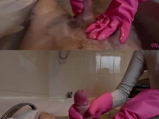 Cheating housewife gives a sensual handjob while cleaning your knob in the bath