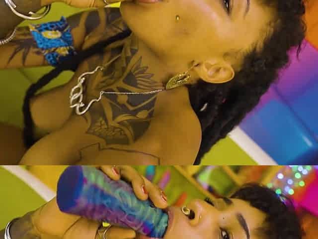 Darksome Skin Tattoo Honey Masturbates Hard with Large Toy