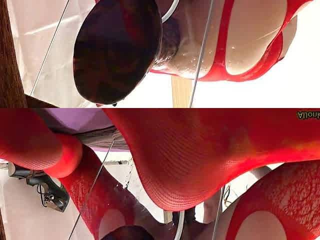 Sissy in a red outfit has fun with big toys, part 3
