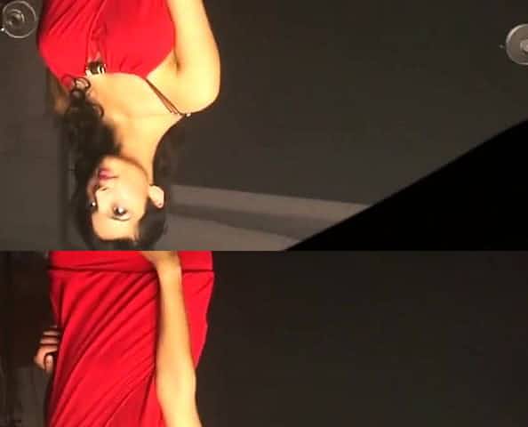 Indian brown-haired with thick melons took off her crimson underpants and stretched up to get banged