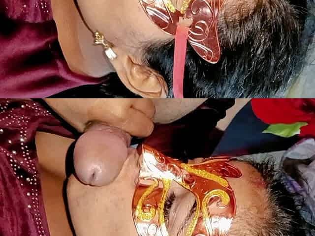 Plus-size girlfriend gives oral pleasure in missionary with her masked Indian aunty