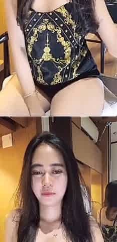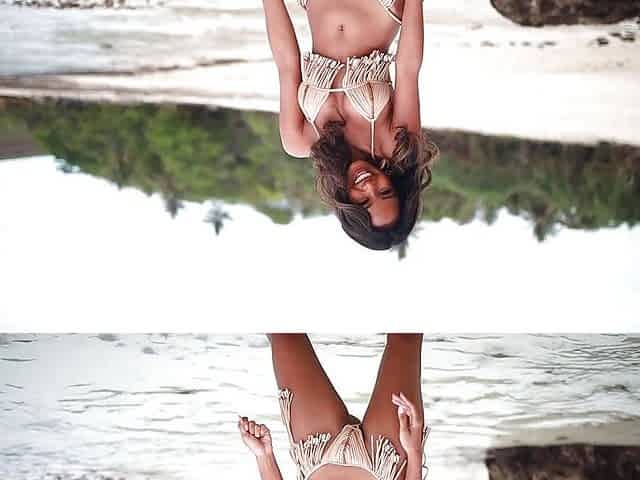 Asian girl, Putri Cinta, in a white bikini pulling her lips apart