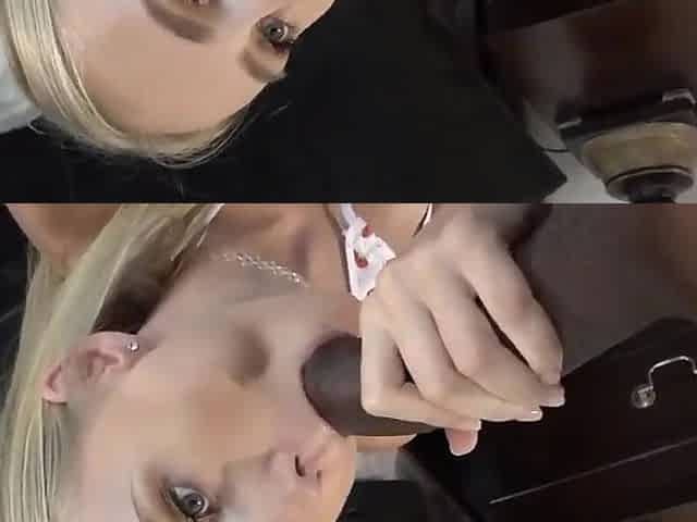 Petite white doll is playing with a massive black schlong using her hands and mouth