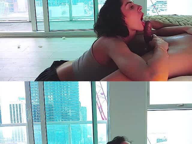 She wraps her lips around his dark pole, eager to enjoy a wild interracial banging