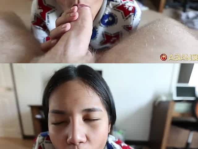 "Sexy cock sucking asian babe takes cum on face POV"