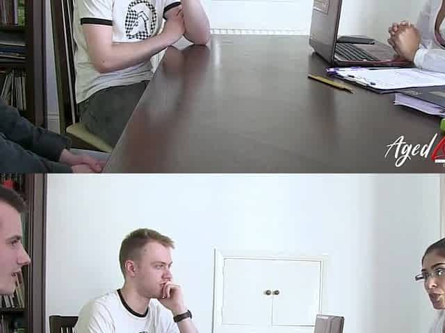 Preliminary interview with the secretary, the lads disrobe in front of her and show her well brawny body.