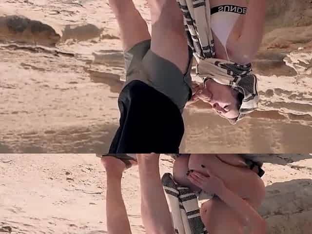 Amateur exhibitionist gets a handjob from horny passerby on the beach