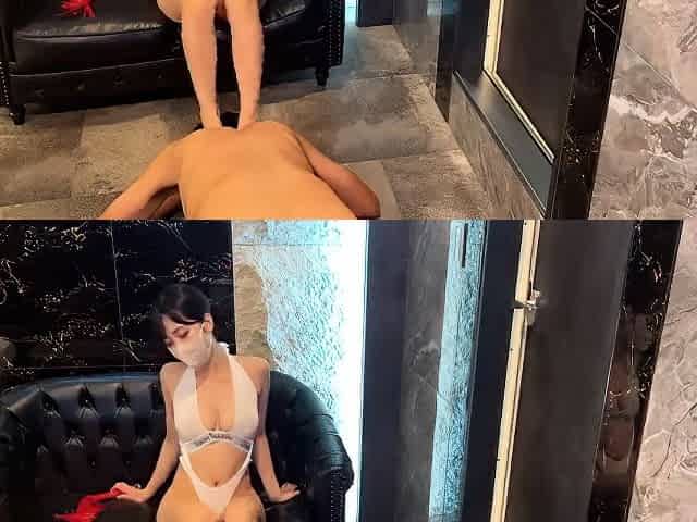 Naughty dominatrix from Japan uses tape to roll her submissive slave and tantalizes his rear. Facesitting and blowjob action!